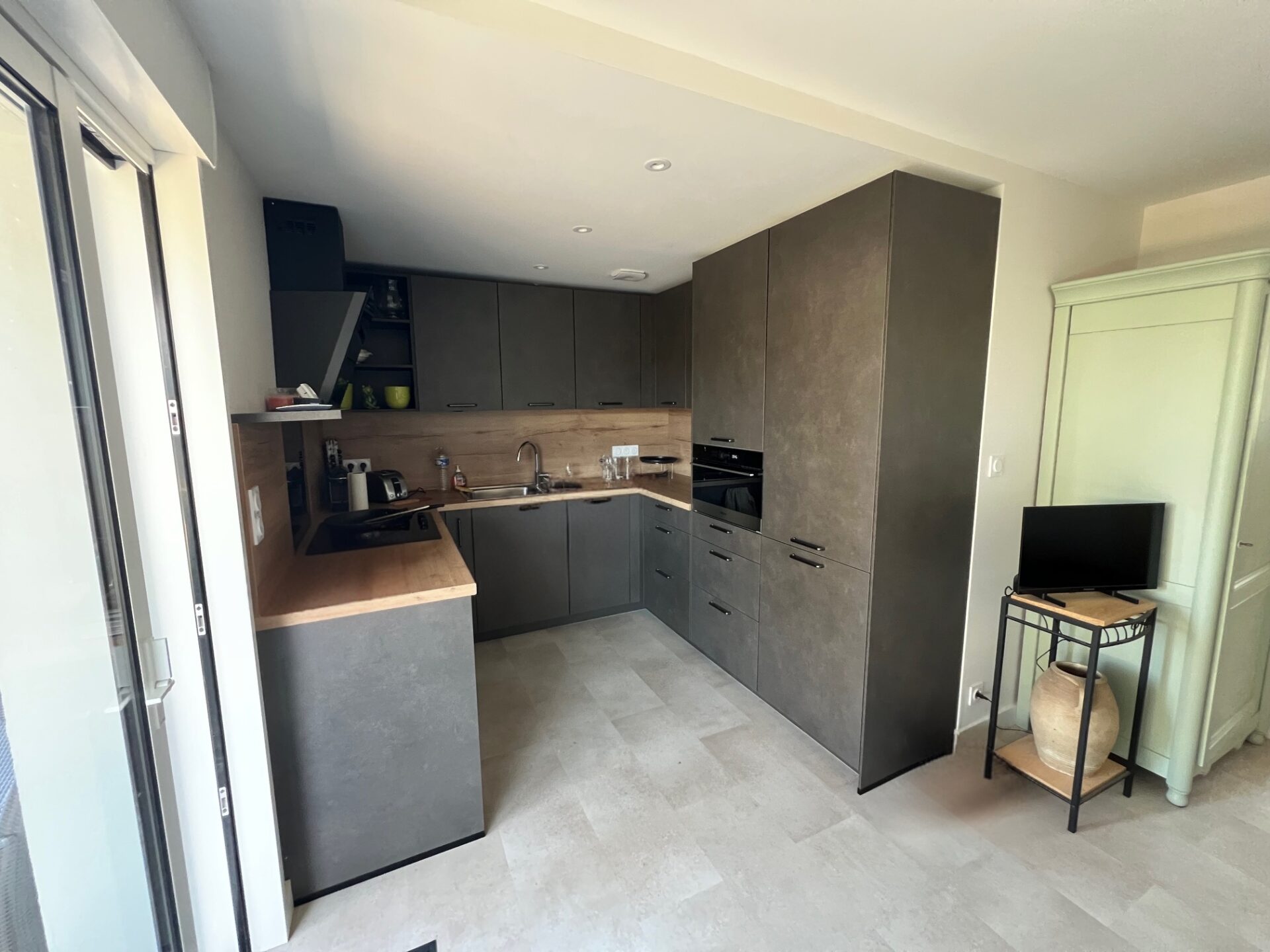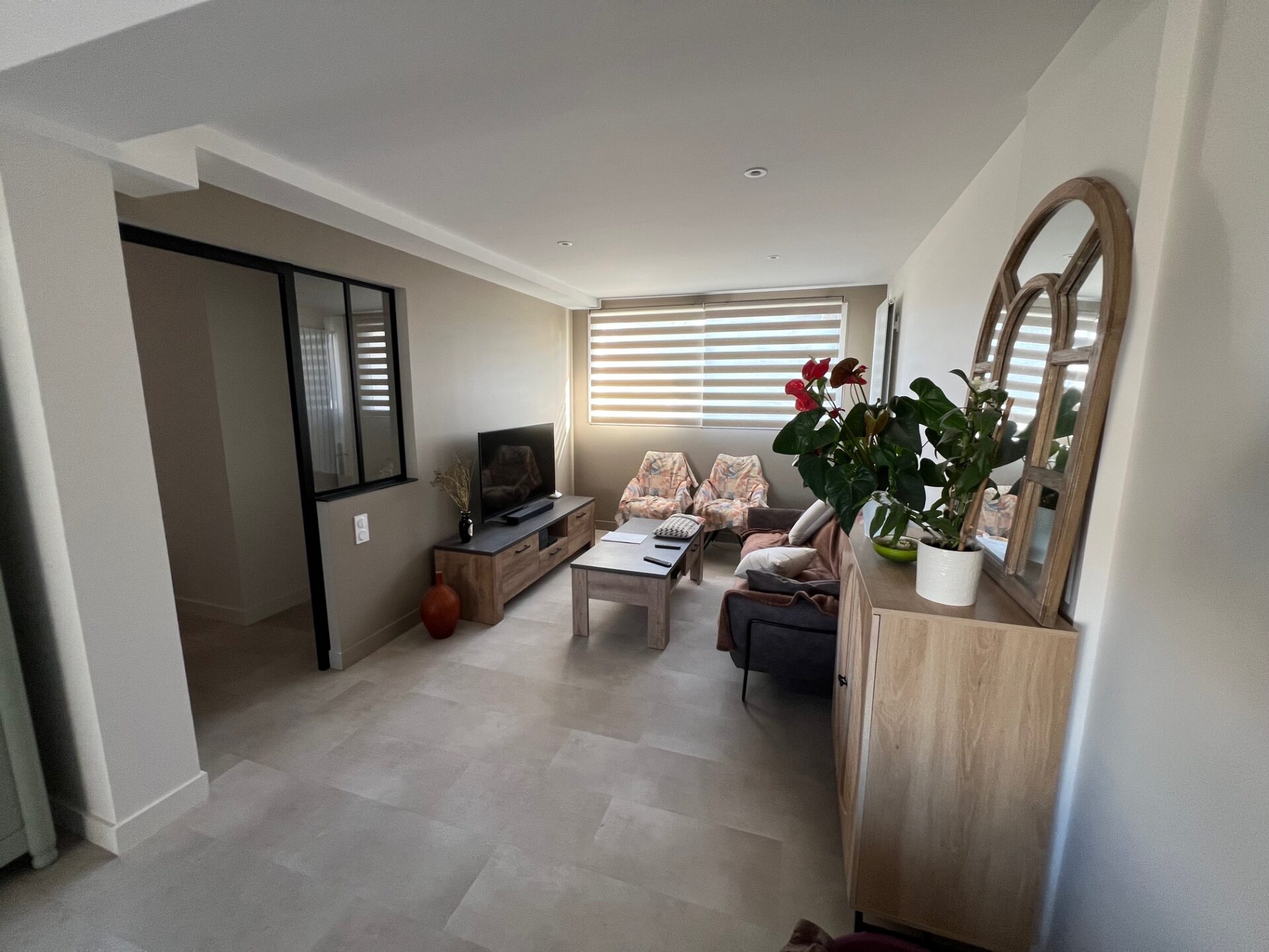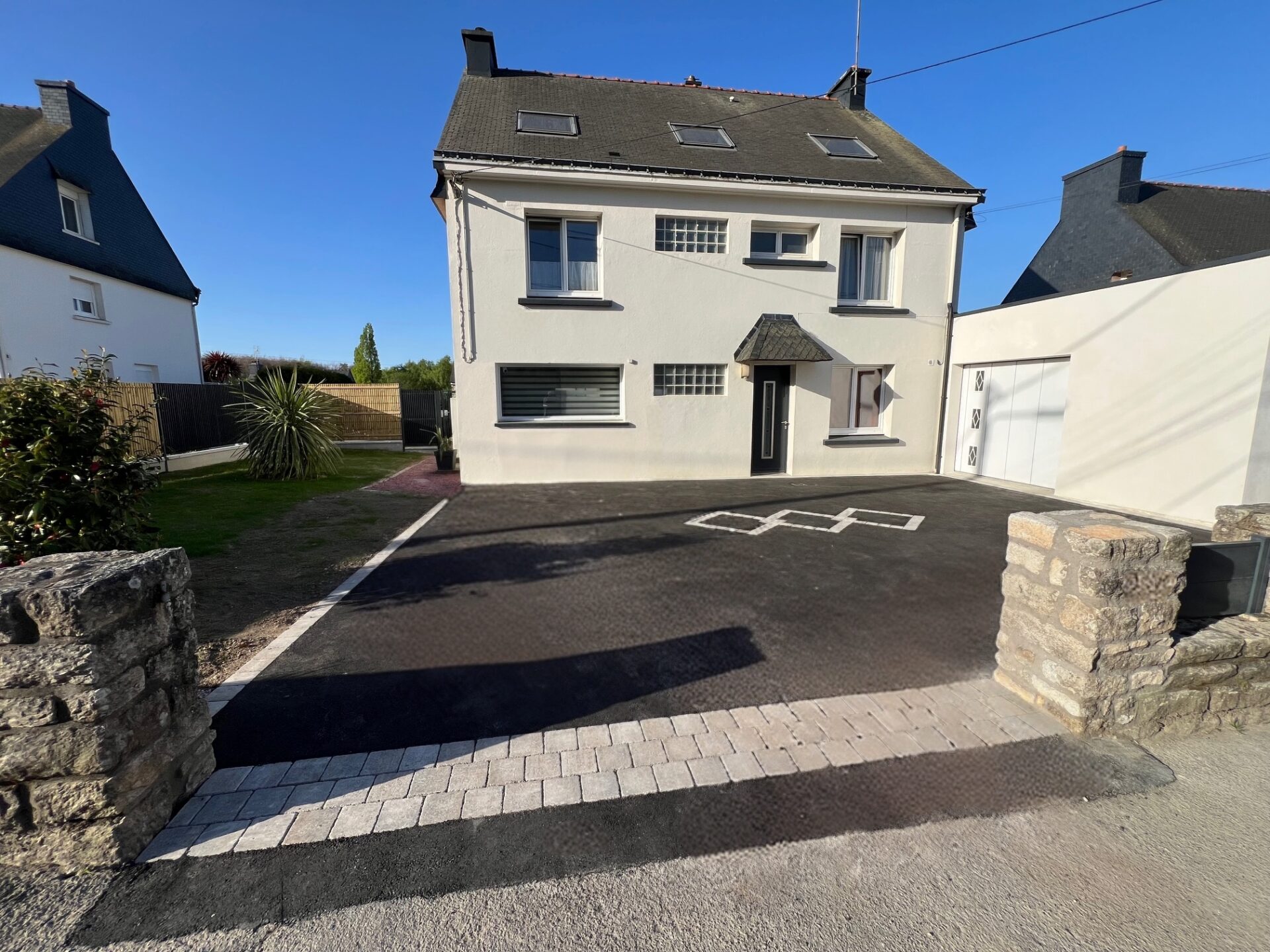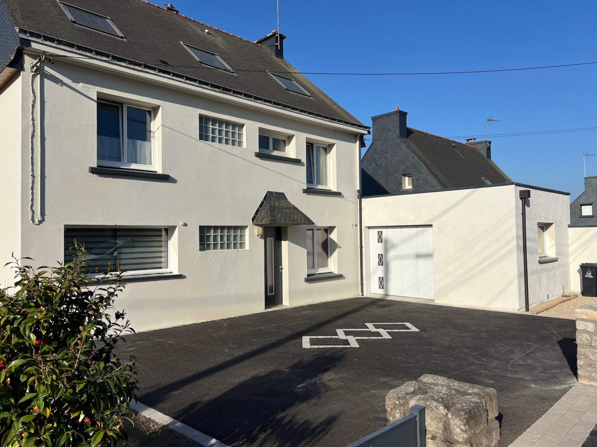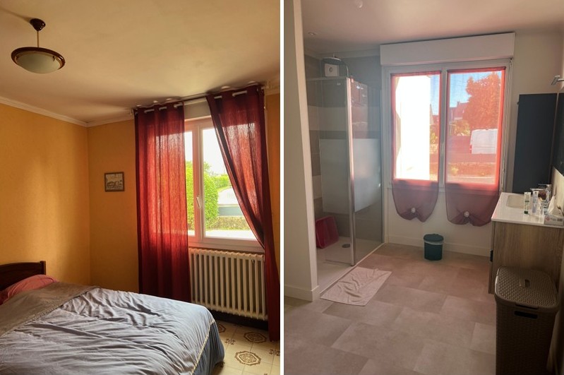 Changement de destination du garage pour devenir la pièce de vie, d’une chambre en salle d’eau avec wc, rénovation intérieure de l’intégralité du bien, extension pour créer une chambre et un garage ainsi qu’un réaménagement des extérieurs.